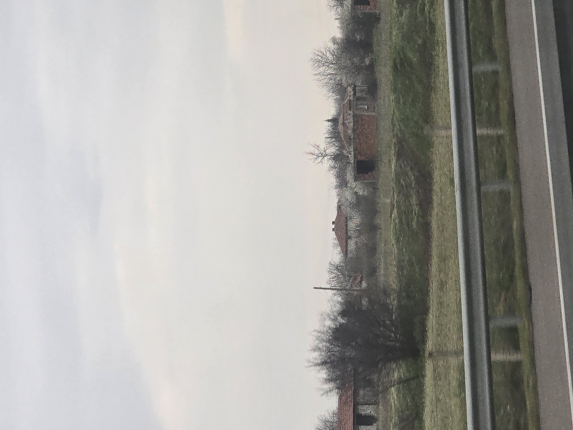 The scene depicts a rural area in the vicinity of Opalchenets, Bulgaria, under an overcast, light grey sky. In the immediate foreground, a grey asphalt road with a single white solid line on its right edge is partially obscured by a metallic grey W-beam guardrail extending horizontally across the lower portion of the frame. Beyond the guardrail, a green grassy slope ascends towards the background, dotted with numerous deciduous trees and bushes. Many trees exhibit bare branches, consistent with late winter or early spring, though some display faint white elements, possibly indicating early blossoms or buds. Multiple single-story structures are visible in the background, mostly partially obscured by vegetation. To the far left, a house with a red-tiled roof and light-colored walls features a dark, recessed opening, possibly a doorway or window. Towards the center-right, a brick building with a red-tiled roof and exposed brickwork is present, showing a dark, open window aperture, suggesting a state of disrepair or being unfinished. Additional structures are partially visible behind the trees further in the background. A single utility pole stands vertically among the trees in the mid-left portion of the image. No individuals are present in the scene.