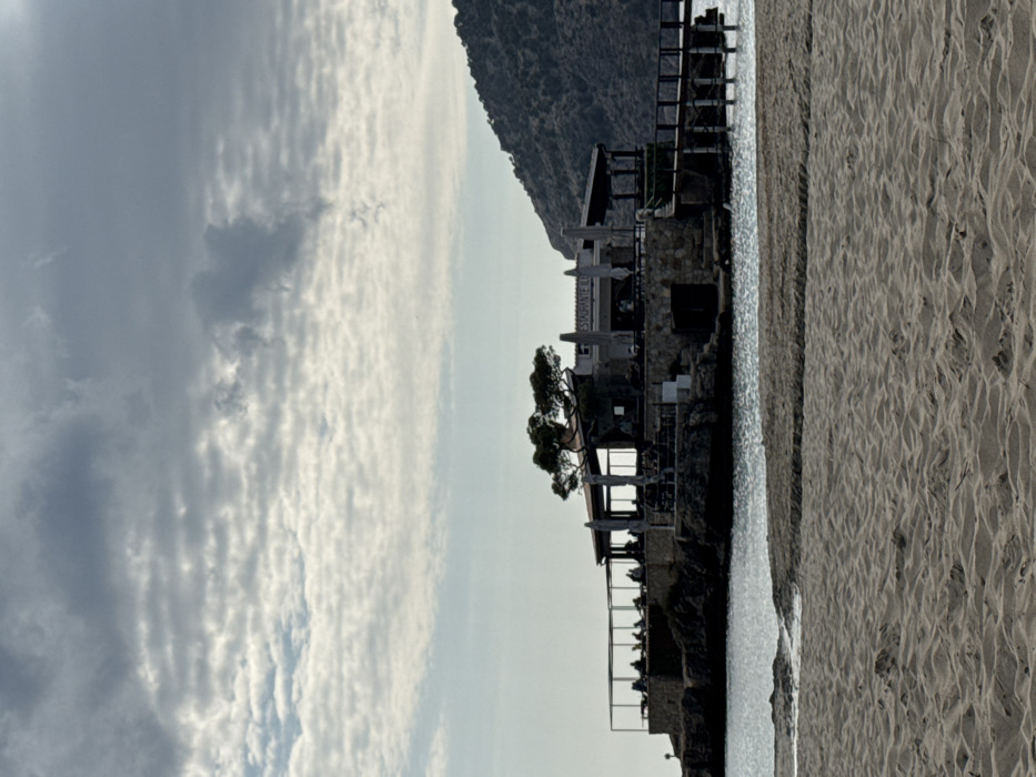 The image depicts a panoramic view of Es Camp De Mar, Spain, focusing on the Restaurante Il Chiringuito, a structure built on a rocky island outcrop within the bay. In the foreground, a sandy beach occupies the lower third of the frame, exhibiting textured ripples and a small, narrow stream of water flowing from left to right into the sea. The midground features calm, dark blue-grey water reflecting the overcast sky. The central subject, the restaurant, is constructed with a dark stone base and multiple levels, featuring a combination of enclosed and open-air dining areas. Several large, light-colored patio umbrellas are visible, some open, some closed, providing shade to outdoor seating areas. Numerous dark figures, appearing to be patrons, are seated at tables on the restaurant's terraces, particularly on the left-most patio which is enclosed by a dark railing. A cluster of small trees with dark foliage grows on the roof or upper level of the building. A wooden pier with railings extends from the right side of the restaurant towards the foreground, supported by dark wooden stilts submerged in the water. The building's architecture is predominantly dark in tone, appearing somewhat silhouetted against a brighter sky. Faint lettering, possibly "RESTAURANTE," is discernible on the building's facade. In the background, a large, dark, vegetated mountain rises steeply on the right side of the frame. The sky above is dominated by a dense layer of altocumulus clouds, displaying intricate patterns and varying shades of grey and white, with lighter patches indicating filtered sunlight. No explicit interactions or specific actions are discernible beyond people seated at tables.