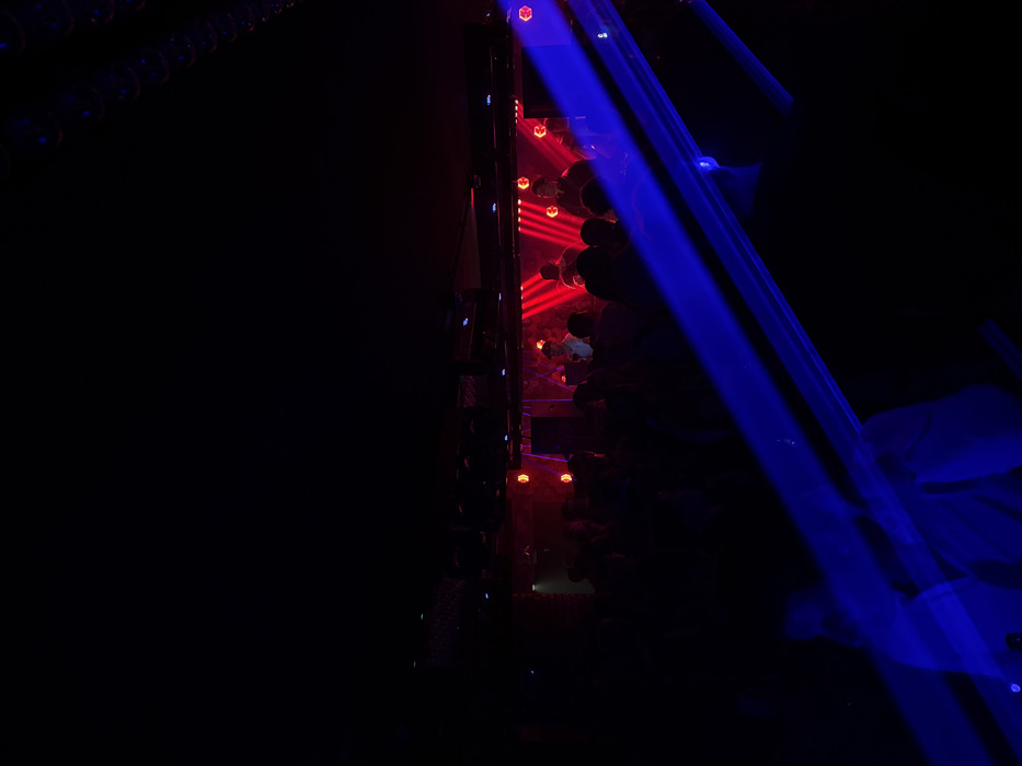 The image depicts an indoor entertainment venue, likely a club or concert hall, located within the city of Madrid, Spain. The scene is predominantly dark, illuminated by theatrical lighting. In the mid-ground, an elevated stage is visible, intensely lit by multiple red spotlights that project distinct conical beams from the background. On this stage, at least three human figures are present, appearing as dark silhouettes against the red light. One figure on the left side of the stage appears to be holding a microphone. Another figure is positioned towards the right side of the stage. Hexagonal light fixtures are also discernable on the stage's backdrop. A dark, rectangular object, possibly a speaker or equipment case, stands on the left side of the stage. Below and in front of the stage, a crowd of people is gathered, their heads and shoulders visible as dark silhouettes, indicating they are facing towards the stage. The foreground is dominated by strong, parallel blue light beams that traverse diagonally from the lower left to the mid-right of the frame. These beams partially obscure the lower portion of the audience and a faint outline of a person's head and shoulder in the bottom-left corner of the image. The upper portion of the image is largely dark, with minimal visible detail beyond faint reflections near the ceiling.