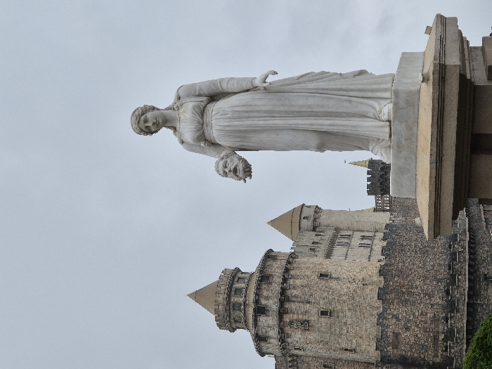 The image displays a white marble statue of a female figure in classical drapery, standing on a multi-tiered stone pedestal in the foreground. The figure holds a severed, bearded male head in her left hand at waist height. In the background, a medieval-style castle complex is visible, featuring multiple stone towers with battlements and conical roofs. A large, round stone tower dominates the left side of the background. The sky is uniformly overcast and light grey. This scene is located at Ba Na Hills SunWorld in Đà Nẵng, Vietnam.