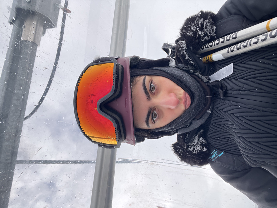 A person wears ski goggles and a balaclava, positioned slightly askew, with ski poles visible. They are in an enclosed space, possibly a gondola or ski lift, with water droplets on the transparent barrier. The person is wearing a dark, quilted jacket with fur trim. The background shows a cloudy, snowy scene.