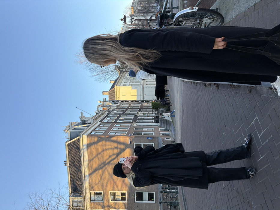 The image captures two individuals on a brick-paved bridge or canal-side street in Amsterdam, Netherlands, during daylight hours under a clear blue sky, with long shadows indicative of low sun angle. Traditional multi-story Dutch canal houses, primarily brick, line the background, with tree shadows cast upon the building on the left. On the left, a person with blonde hair, dressed in a black beanie, black long coat, dark trousers, and dark flat shoes with metallic accents, holds a white smartphone horizontally, aiming it towards the right side of the frame. On the right, a second person with long blonde hair and dark glasses, clad in a long black coat, black gloves, and light-colored sneakers, stands facing the first individual. This person's right arm is extended forward at shoulder height with an open palm, and a dark tote bag is held in their left hand. A bicycle is parked against the bridge railing on the right, adjacent to a black ornate lamppost. Further bicycles are partially visible on the left. Several smaller, distant figures are discernible walking in the background on a path leading past the canal houses. The primary interaction is the first individual photographing or videoing the second.