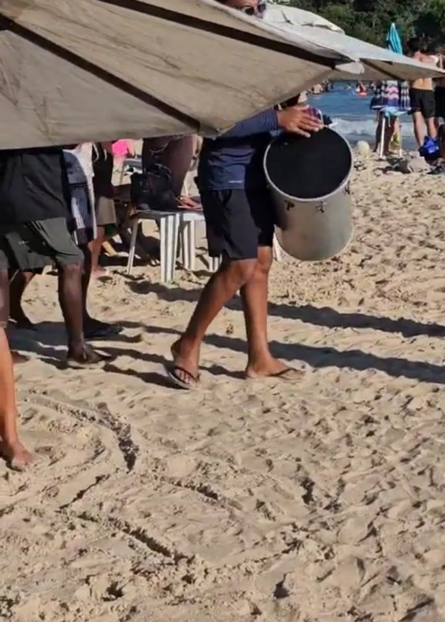 man carrying a large metal drum along a sandy beach. The man is wearing a long-sleeved blue shirt, black shorts, and flip-flops, and he has sunglasses on. The drum is held with a strap over his shoulder. Several other people are walking nearby. Beach umbrellas, chairs, and some people relaxing on the beach can be seen in the background. The sky is clear and blue. The environment indicates a sunny day at the beach with people enjoying leisure activities.