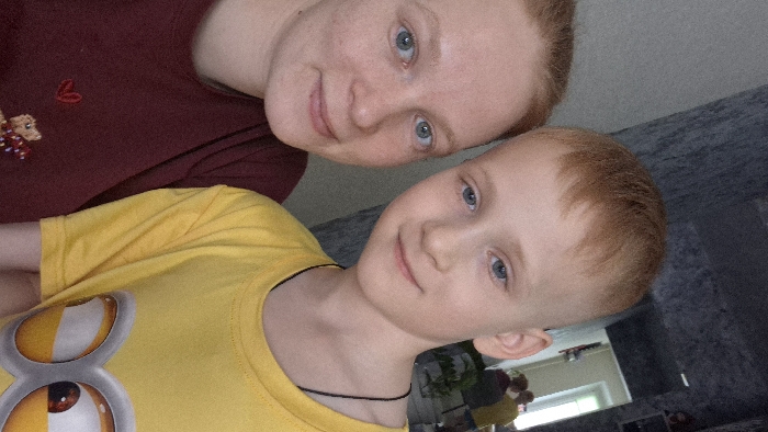 The image displays an adult female and a male child in a close-up indoor portrait. The female, positioned on the left, has light skin, red hair, and blue eyes, wearing a maroon short-sleeved top with a small red heart and an embroidered figure. The child, on the right, has light skin, short red hair, and blue eyes, dressed in a yellow short-sleeved t-shirt featuring a Minion goggles graphic and a thin black cord necklace. Both individuals exhibit neutral expressions with slight smiles while looking directly at the camera. The background consists of a textured grey wall on the left and a large mirror reflection on the right. The mirror reflection shows a brightly lit window, indistinct figures of other individuals, and interior elements including a potted plant. The specific location within the city of Chaikovsky, Russia, cannot be determined from the visual information provided.