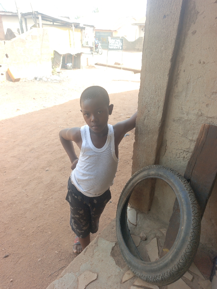 The image depicts a young male child standing outdoors in a street environment within Akwanga, Nigeria