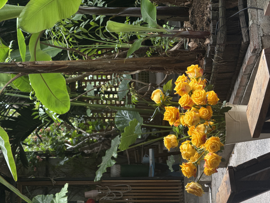Yellow roses droop from a white pot, juxtaposed against a lush garden. Banana leaves frame the scene, revealing a lattice background. A wooden beam and rustic brick wall suggest an outdoor setting. Lower shelves hint at a greenhouse or enclosed garden space. Natural light bathes the plants, creating shadows and highlights.