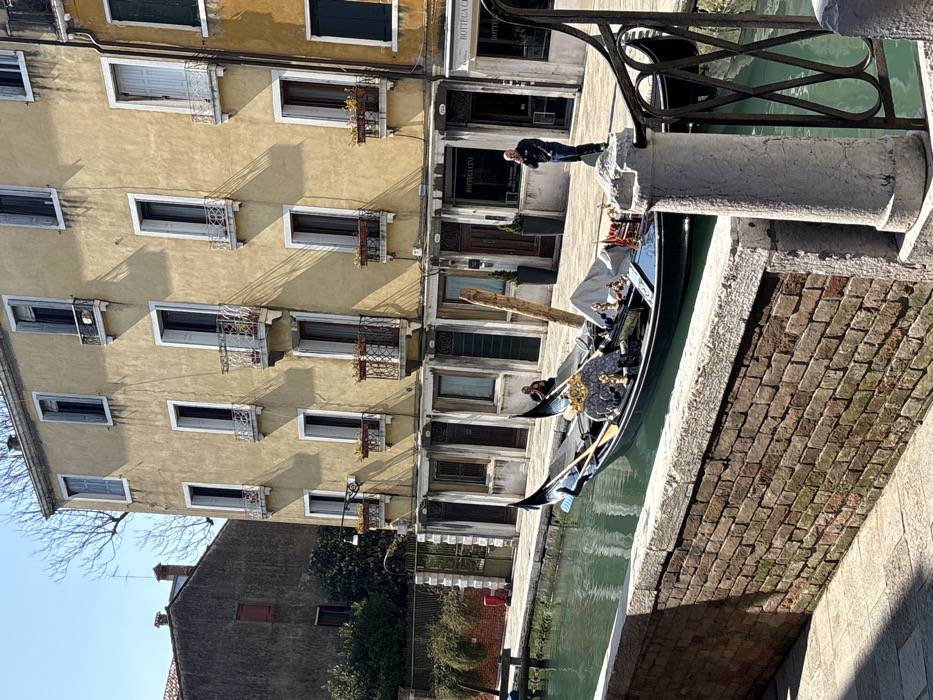 This image depicts a sunlit canal scene at Fondamenta Priuli along the Rio di San Trovaso in Dorsoduro, Venice, Italy. The foreground features a low, weathered red brick wall with a stone cap, partially obscured by a decorative wrought-iron gate and a stone pillar on the right. The canal, filled with green water, contains two black gondolas. The prominent gondola in the mid-ground is decorated with elaborate gold and silver elements, including a large winged or seahorse-like figure, small statues, and white coverings. A tall, weathered wooden mooring pole stands vertically in the canal near this gondola. Beyond the canal, a stone-paved walkway (fondamenta) runs parallel to the water. On this walkway, two individuals are visible. To the left, a person in dark clothing is seated on the canal bank near a small wooden bench and a red post. To the right, another person, dressed in a dark jacket and blue jeans, stands and holds a white object, likely a mobile phone, to their right ear, appearing to be engaged in a conversation. The background is dominated by a three-story building with a faded yellow stucco facade, featuring multiple rectangular windows with white frames and open shutters. Several windows on the upper floors have small, ornate white wrought-iron balconies, some adorned with brown flower boxes containing plants. The ground floor of this building features multiple dark wooden doors and storefronts, one prominently displaying "BOTTEGA CINI" and another "BOTTEGA". To the far left, behind the yellow building, a darker, grey building with a single red-shuttered window is visible. The scene is under strong natural light, casting distinct, elongated shadows from the buildings and architectural features across the yellow facade and the waterway, indicative of a clear, sunny day. Bare tree branches are visible against a bright blue sky at the top left.