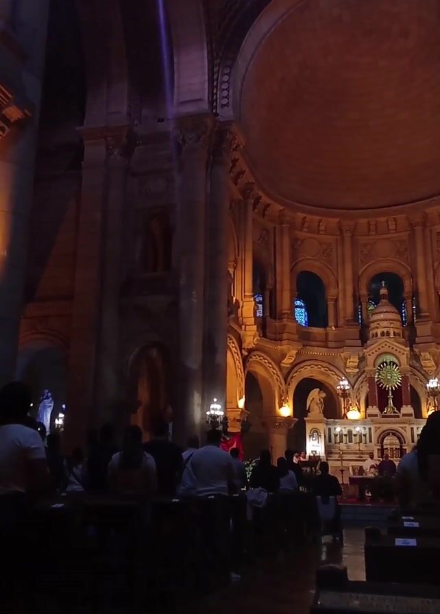interior of a large church with people sitting in pews. The church has tall pillars and a large dome, with ornate decorations and stained glass windows. A spotlight shines down from the ceiling. An altar is in the distance, elaborately decorated. Some people stand in front of the altar. Most people are sitting in pews in the foreground. The lighting is dim, with warm tones from the interior lights.
