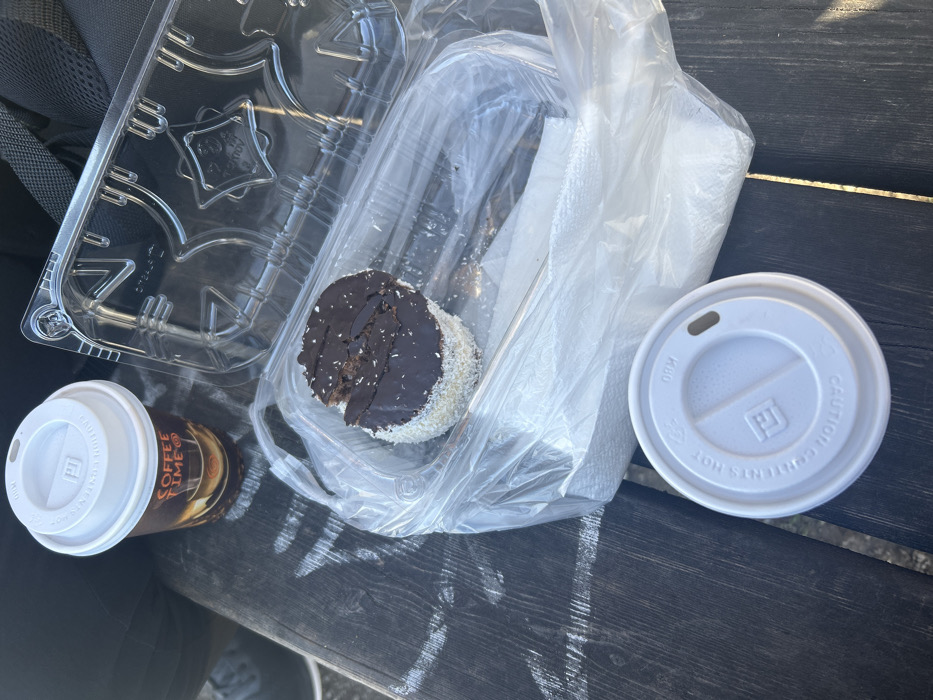 An overhead shot captures a small meal arranged on a dark, worn wooden surface, likely a picnic table or bench, displaying visible wood grain, scratches, and faint white markings. The scene is set in an outdoor public space within the city of Salzburg, Austria. In the upper left, a disposable coffee cup with a white lid is visible, featuring a brown and orange design with the text "Coffee Time" and graphics of coffee beans and a coffee cup. Adjacent to it, centrally positioned, is a clear plastic clamshell container. Inside the container, a partially consumed round pastry or cake is present, featuring a dark chocolate top with white coconut flakes coating its sides. A section of the pastry is missing from one edge, revealing a lighter interior. The plastic container is open, with its top half folded back, and is situated within a transparent plastic bag. A folded white paper napkin and a small, clear plastic fork are also inside the bag, beneath the pastry. In the lower center, another disposable white coffee cup with a matching lid is visible; this lid bears the text "CAUTION CONTENTS HOT" and "KBU", along with a stylized 'P' logo, also seen on the first coffee cup's lid. A person's dark-clad knee and lower leg are partially visible at the far left edge of the frame, suggesting a seated individual at the table.