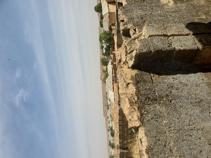This image presents an elevated, wide-angle view of a residential area in Birnin Kebbi, Nigeria, under a hazy, pale blue sky. In the immediate foreground, a heavily weathered and damaged concrete or mudbrick wall structure is prominent, displaying significant erosion, crumbling sections, and dark, irregular staining suggesting organic growth or moisture exposure. Its texture is rough and mottled. Beyond this foreground structure, the midground reveals a dense cluster of low-rise buildings, characteristic of a local settlement. These structures primarily feature light-colored, possibly earthen or rendered walls, topped with various roof types, some appearing flat or gently sloped, in shades of reddish-brown, tan, or grey. Green foliage from scattered trees is visible among the buildings. The background shows a distant, faint brown horizon line, consistent with a dry or dusty environment, potentially a plateau or elevated landform. The sky above is pale blue with wispy, scattered white clouds, and a small, dark bird is visible in flight in the upper left quadrant. No individuals or discernible activities are present. The overall scene suggests an arid climate and established, modest housing architecture.