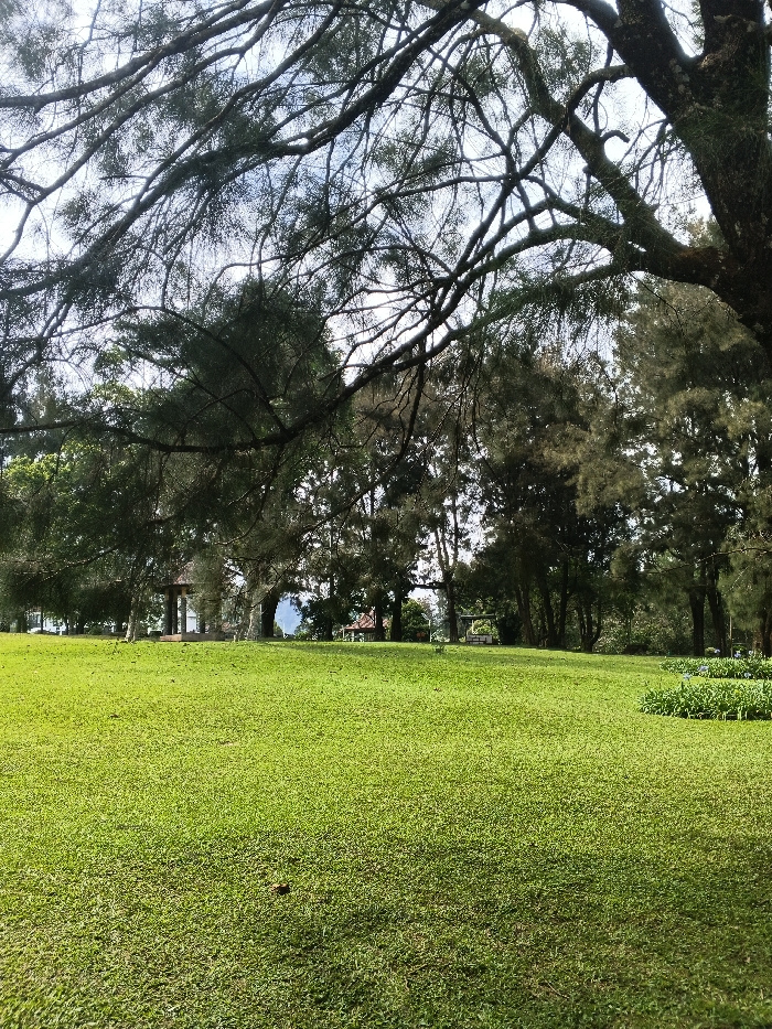 The image displays a park located in Baglung, Nepal. The foreground and midground consist of a meticulously maintained, vibrant green lawn. A large tree, characterized by dark, gnarled branches with sparse foliage, extends across the upper section of the frame, partially obscuring a bright, diffused sky. Beyond the lawn, a dense treeline composed of tall, dark green trees forms the background. Within this treeline, two gazebo-like structures are visible: a light-colored, open-sided structure with a pointed roof stands on the left, and a smaller, darker structure with a distinct roof is positioned further right. A small patch of broad-leafed plants, possibly with developing or past blooms, is present on the right side of the lawn in the midground. No individuals or active subjects are visible within the scene. The lighting indicates natural daylight.