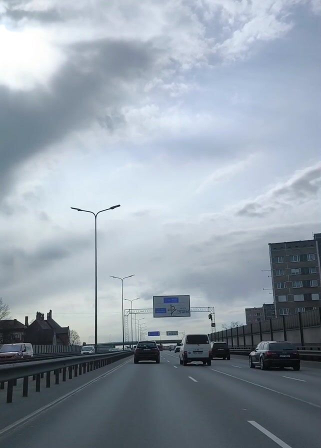 view from a car driving on a highway. The sky is overcast with gray clouds. Multiple cars are visible on the road, driving in the same direction. The road has several lanes and is lined with guardrails. Streetlights are placed along the side of the road. Buildings are visible in the background. A large overhead sign shows directions to various locations.
