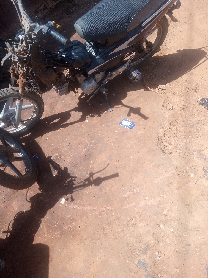 This image depicts a partially disassembled motorcycle in an outdoor setting in Kakuri Gwari, Nigeria