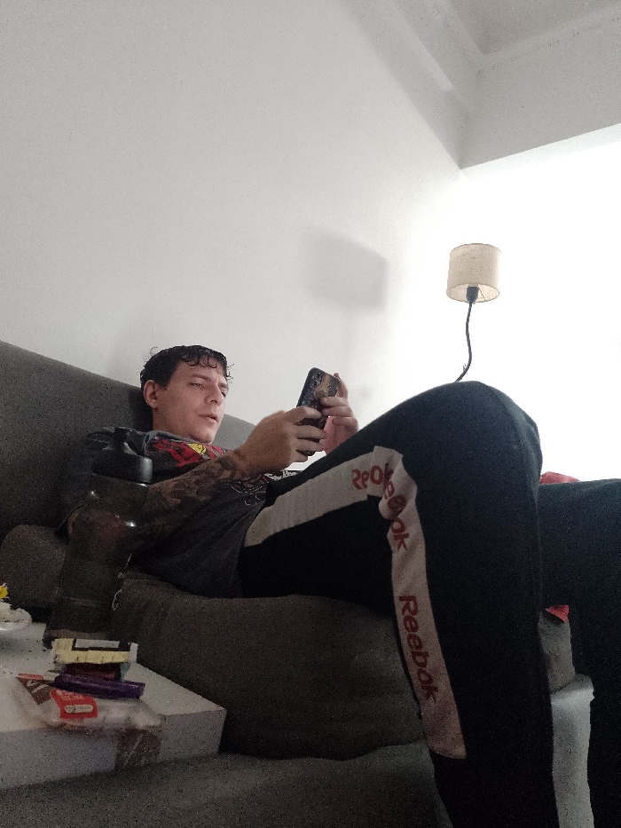 An indoor scene depicts a male individual, appearing to be a young adult, reclined on a grey upholstered sofa or chaise lounge. He has short, dark, curly hair and visible dark, intricate tattoos on his left forearm and upper arm. The individual wears a dark t-shirt with a multi-colored graphic design on the chest and black sweatpants featuring white vertical stripes on the outer legs, each stripe bearing the repeated red "Reebok" logo. He is holding a dark-colored smartphone with both hands, his gaze directed downwards at the device. To the left of the individual, on a low white surface, are several small objects, including white and yellow rectangular packets resembling rolling papers, multiple small cylindrical objects (two purple, one yellow, one red), and a small red, flat item. In the upper right background, a small table lamp with a light-colored fabric lampshade and a thin, dark, curved base is visible against a plain, light-colored wall. The environment is brightly lit. Specific visual indicators to determine a precise location within the city of Buenos Aires, Argentina are not present within the image.