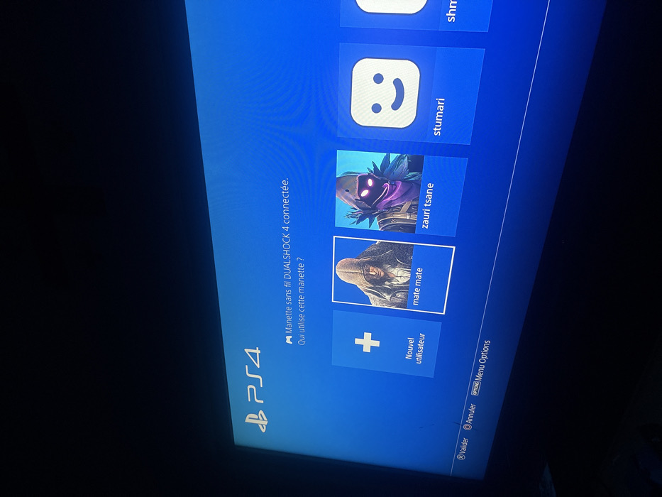 PlayStation 4 (PS4) screen displaying the user selection interface. It indicates a wireless DualShock 4 controller is connected, asking which user will use it. The screen displays four user accounts: "mate mate", "zauri tsane", "stumari", and "shm". A "New User" option is also available. The interface includes options to validate a selection, cancel, and access the menu options. The language used is French.