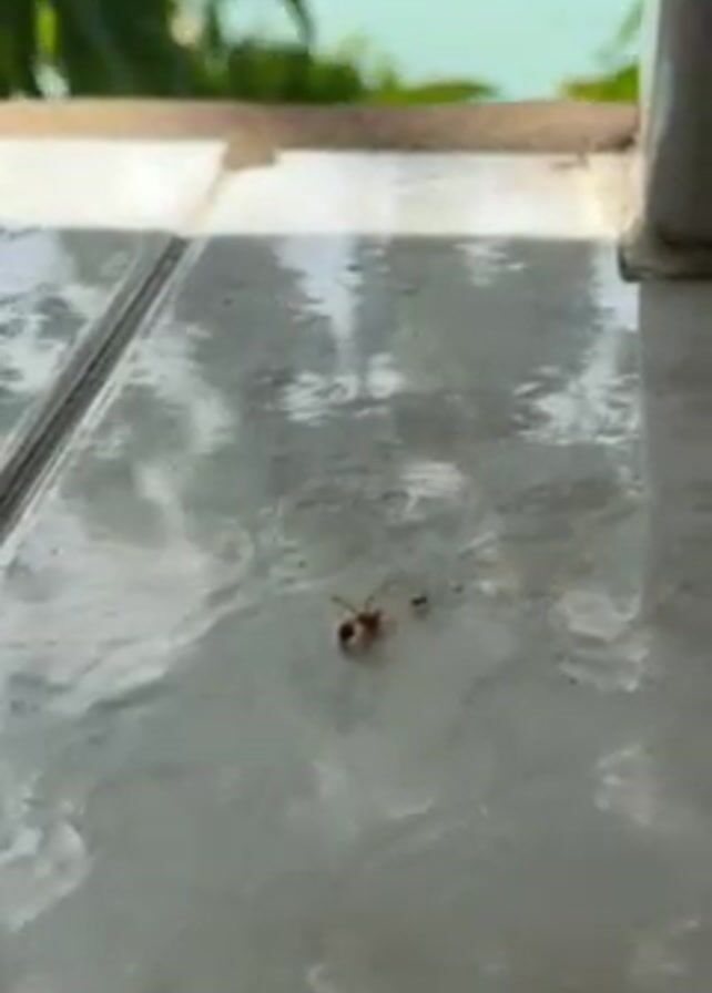 A close-up static shot shows a white, slightly glossy tiled surface with a small red ant moving on it