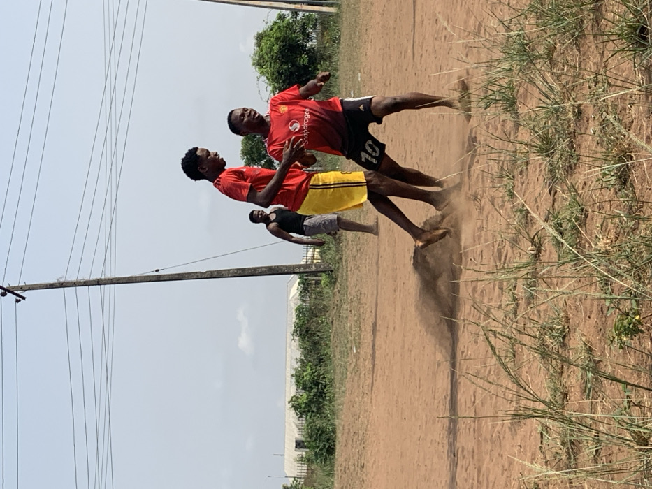 This image depicts an outdoor scene in Ihiagwa, Nigeria, showing three males on a reddish-brown dirt field under a clear sky