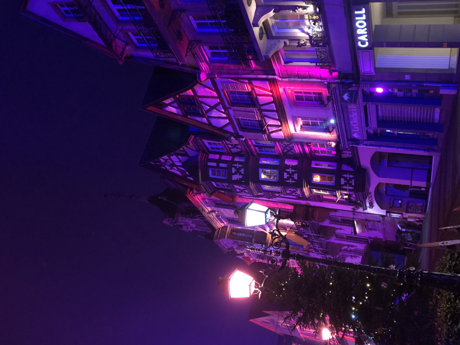 Buildings illuminate with purple and pink lights at night. Architectural details of the buildings are emphasized with the vibrant colors. Lanterns cast warm glows near the bottom of the frame. A tree adorned with lights adds to the festive atmosphere. A building with the name "CAROLL" stands out amidst the scene.