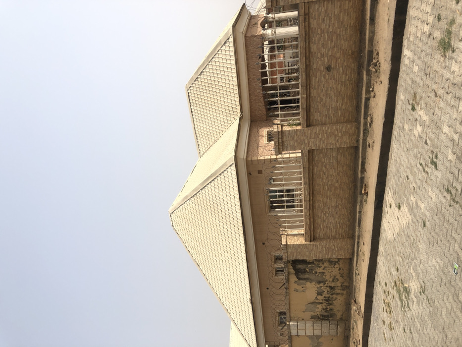 A single-story residential building is depicted from a street-level perspective under a clear, bright sky. The building features a prominent beige or light-tan hip roof constructed with overlapping tiles. The exterior walls are also a light-tan or beige color, with textured finishes. Multiple rectangular windows, each secured with white or light-colored horizontal and vertical security bars, are visible. The property is enclosed by a perimeter wall, approximately 1.5 to 2 meters high. The lower section of this wall is constructed from tan-colored brick-like tiles, while the upper section, particularly on the left, is rendered and painted light yellow, showing significant peeling paint, discoloration, and dark stains. Above the wall, along its length, multiple strands of razor wire provide additional security. The street in front of the property is paved with light-colored interlocking pavers, some of which are displaced or missing, allowing sparse weeds to grow. A narrow dirt and gravel verge separates the paved street from the perimeter wall. No individuals, vehicles, or explicit signs indicating a specific street or district are visible within the frame; however, the architectural style and urban setting are consistent with a residential area in Abuja, Nigeria. The scene appears dry and illuminated by natural daylight.
