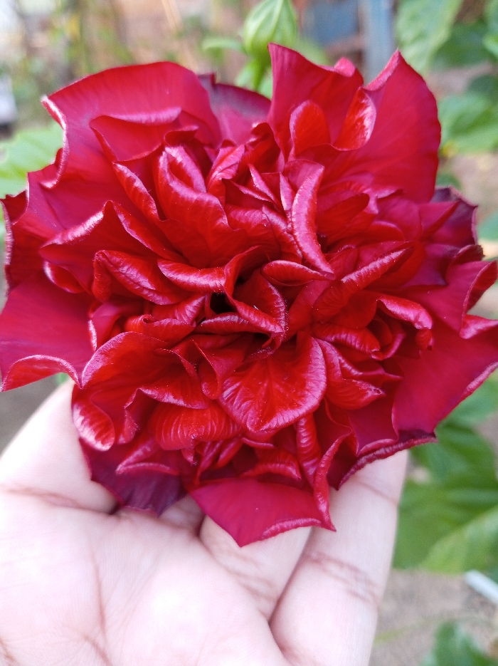 A close-up, eye-level photograph depicts a single, fully bloomed, deep red flower, likely a hibiscus cultivar, held by a human hand. The flower is densely packed with numerous overlapping and ruffled petals, exhibiting a rich, glossy crimson color with subtle darker undertones and lighter highlights along the petal edges. A thin, pale fringe is visible on some outer petal margins. The supporting hand, visible from the palm and finger base in the lower-left, displays natural skin tones and distinct dermatoglyphics, gently cupping the flower from below. The background is out of focus, consisting of blurred green foliage and indistinct earthy tones, indicative of an outdoor garden or natural environment under natural light. The scene is located in the city of Santo Domingo, Venezuela.
