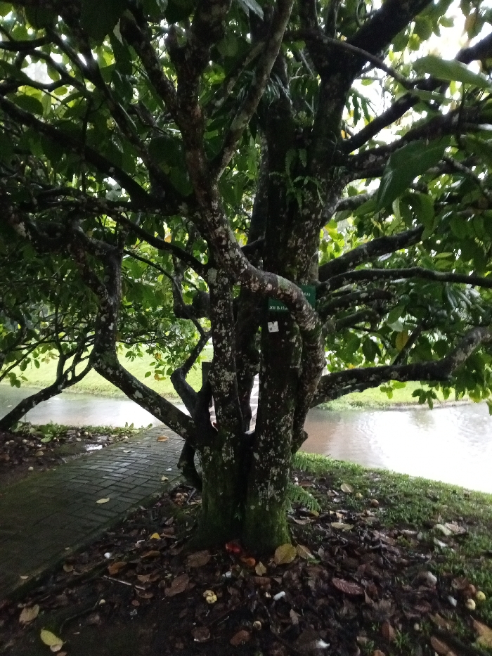 A tree with multiple trunks stands prominently, its branches reaching out with dense green leaves. A small, labeled sign is attached to one of the branches. The tree is surrounded by dark, damp soil, scattered with fallen leaves and small, light-colored objects. To the left, a brick-paved path leads toward a body of water visible in the background. The scene is shrouded in soft, diffused light, suggesting an overcast day.