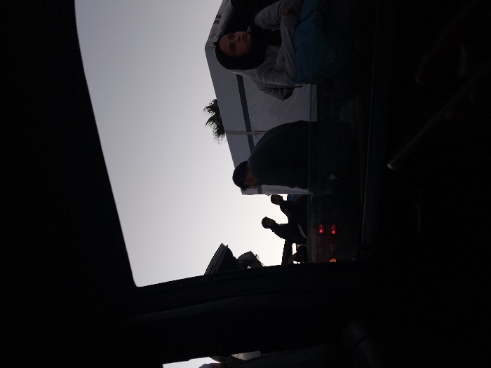 The image, taken from inside a car looking up through the sunroof, features several people outside. One person, possibly female, is reclining with a blue bag. A man in a black shirt and cap is bending over. Further in the background, two more figures are visible near what appears to be a parked vehicle with tail lights illuminated. The overall scene is slightly underexposed and angled.