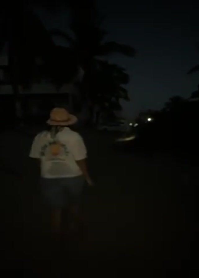 A person wearing a straw hat, white shirt with a graphic on the back, and a denim skirt walks away from the camera down a dark road at night. Palm trees line the left side of the road, and a building is visible behind them. Streetlights are visible in the distance. The person is walking at a slow pace.