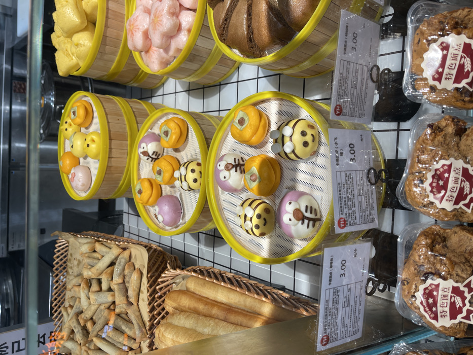 The image depicts a retail food display counter in Jinshui District, China, presenting a variety of pastries and steamed buns under bright overhead lighting