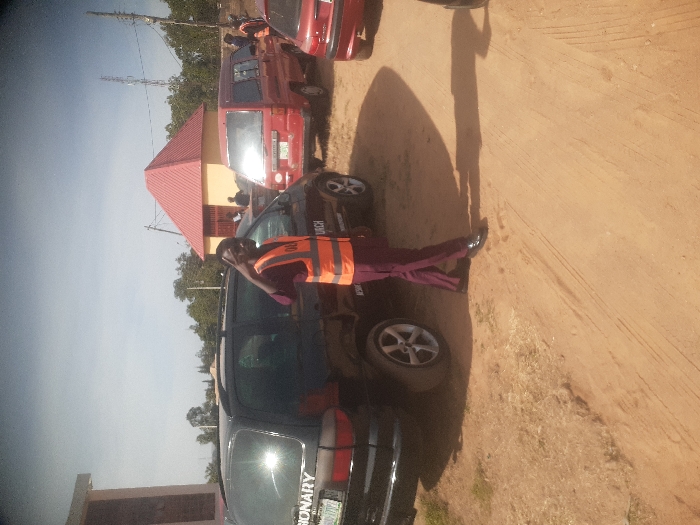 This image depicts an outdoor scene in Gura Top, Nigeria, under a bright, hazy sky. The ground consists of reddish-brown dirt with visible tire tracks. In the foreground, a male individual walks from left to right, his body angled towards the right. He wears a maroon long-sleeved shirt, matching trousers, and an orange reflective safety vest with "GBA" printed on the left chest. His right hand is raised to his temple, forming a 'V' shape with his fingers. To the left of the man is the rear section of a black minivan or SUV, with "MISSIONARY" visible on the rear window and "CHURCH" on its side. Its license plate is partially visible, showing "ABUJA". Further into the background, a red van is parked behind the black vehicle. On the far right, the rear of a red sedan is partially visible. In the mid-ground, behind the vehicles, a small, square-based building with yellowish walls and a distinctive reddish-orange pyramidal corrugated metal roof is visible. To the far left, a portion of another light-colored building is present. The background features sparse trees, utility poles, and a tall metal lattice structure, possibly a telecommunications tower. Several other individuals are vaguely visible in the background, some appearing to wear similar orange vests.