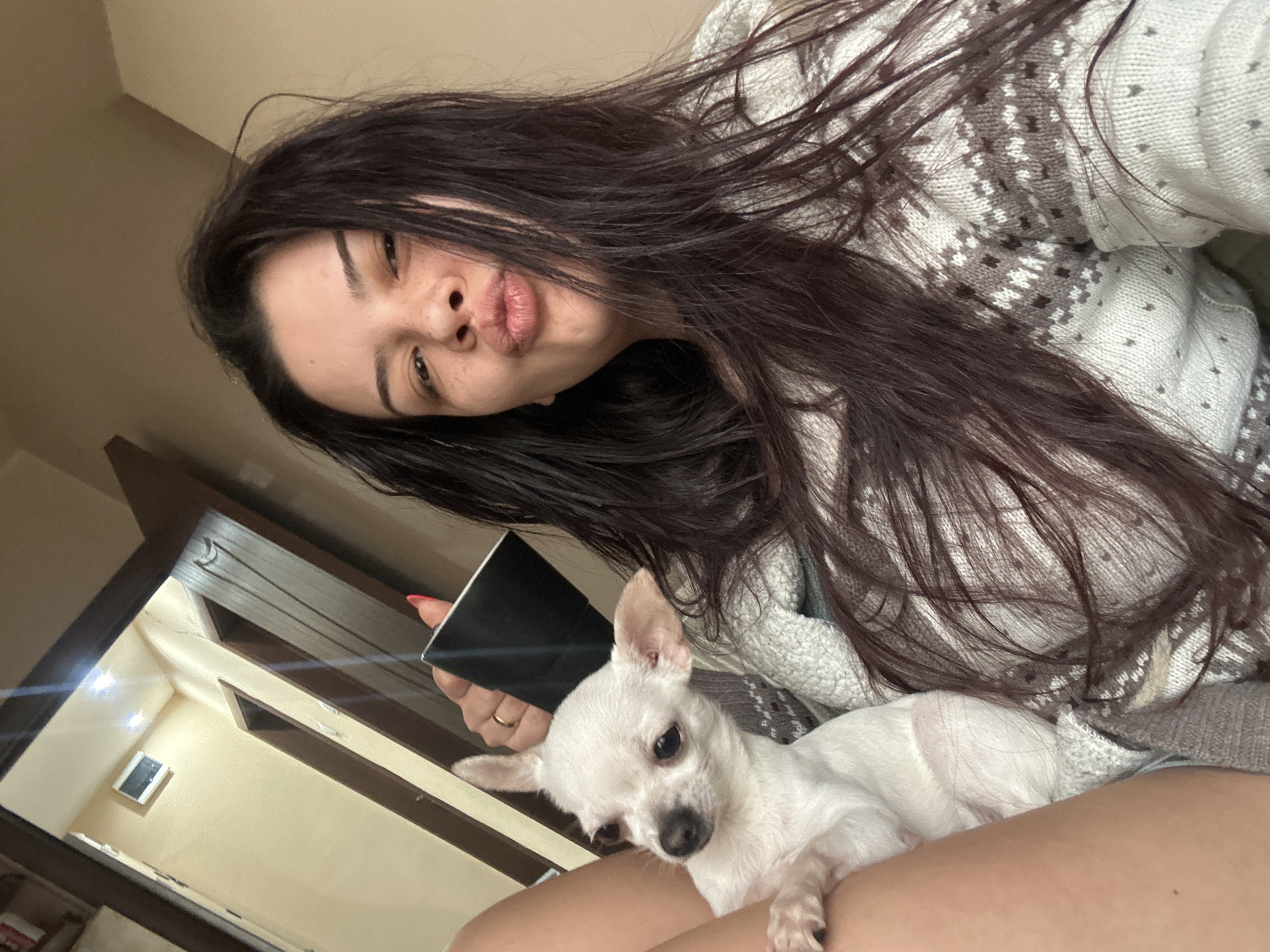 A medium, angled selfie depicts a woman with long, dark hair, wearing a patterned white and gray sweater. She is holding a black object in her right hand, with a red fingernail visible. A small, white chihuahua is resting on her lap. The background shows a section of a hallway or room with beige walls and dark wood trim. A light fixture is visible on the wall. This image does not contain the information required to locate it within the city of Sliven, Bulgaria.