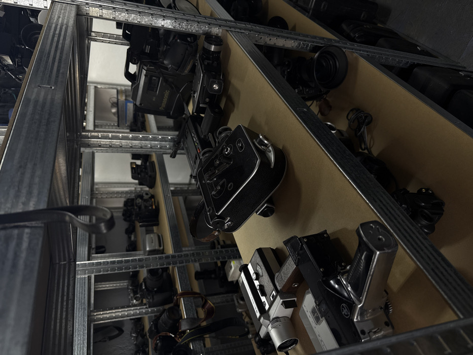 The image displays an indoor storage or collection facility located within Mexico City, though a specific address is not discernible. The scene is dominated by multiple industrial-style metal shelving units with light brown, likely particle board or plywood, shelves, heavily laden with a diverse collection of vintage and professional photographic and videographic equipment. In the foreground, a black strap or handle hangs from the upper shelf. The main focus is on the middle and lower visible shelves. On the mid-level shelf, a black Panasonic professional video camera (camcorder) is positioned on the right. To its left are a black vintage film camera with a silver lens and another black camcorder with a digital readout. On the shelf directly below, from left to right, are two vintage cine cameras—one with a silver lens and black body, another partially obscured—and a prominent black vintage Super 8 or 16mm film camera, possibly a Bolex, angled to reveal its textured grip and control dials. The shelf above the Panasonic camcorder contains a variety of still cameras, predominantly black DSLRs or SLR film cameras with lenses, alongside a vintage instant camera (Polaroid-style) on the right. In the background, additional shelving units extend, densely populated with a vast array of other cameras, lenses, and accessories, suggesting an extensive inventory or collection. The environment features light-colored walls and artificial lighting. No individuals are present.