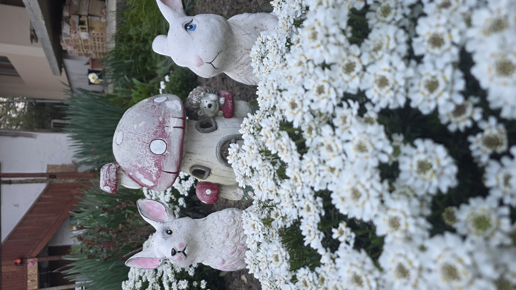 The scene is an outdoor garden in Ledenik, Bulgaria. A white painted ceramic rabbit with pink inner ears is positioned in the foreground. Behind the rabbit is a ceramic mushroom house with a small hedgehog figure on top. Behind the mushroom house is another ceramic rabbit, which is partially obstructed by a dense cluster of white flowers with yellow centers. The background includes green vegetation and an out-of-focus building with a stack of bricks.