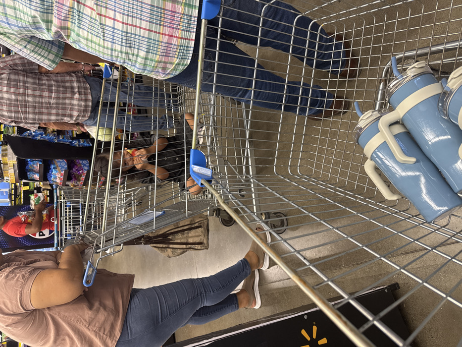 The image depicts an interior scene at a Walmart supermarket in La Ceiba, Honduras. In the immediate foreground, a metal shopping cart contains three light blue insulated tumblers, each with a light tan handle, a clear lid, and a blue straw. Directly behind this, a second metal shopping cart holds a young child, appearing to be female, with dark hair, sitting cross-legged on the cart's base. The child is wearing a dark shirt and is seen holding a small, red, fruit-like object to her mouth, actively eating it. To the left, a woman is partially visible, dressed in a light brown, short-sleeved top and blue jeans, wearing brown slip-on shoes with white soles. She is positioned next to a shopping cart, with a brown handbag hanging nearby. Further to the right, an individual is partially visible from the waist down, wearing a brown plaid shirt, blue jeans, and brown shoes, standing behind another shopping cart. On the far right, a person's lower torso and legs are visible, wearing a green, white, and red plaid shirt and blue jeans, also near a shopping cart. In the background, retail shelves stocked with various packaged goods are visible, and another individual in a red shirt is seen holding a plastic bag near a distant shopping cart. The floor is grey concrete, and a partial yellow starburst logo, consistent with Walmart branding, is visible on a black display stand on the far left.