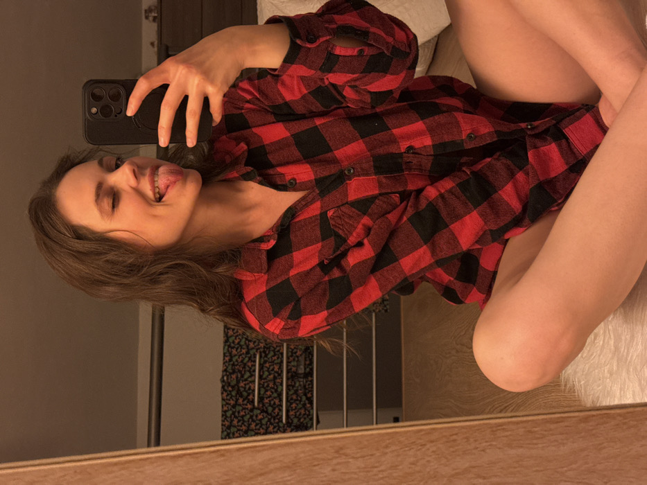 A female individual with long, dark brown hair is depicted in a mirror selfie, seated cross-legged on a white, fluffy rug atop a light wood floor. She is wearing an oversized red and black plaid button-up shirt, with her legs bare and crossed at the ankles. Her right eye is closed in a wink, and her tongue is extended from her mouth. She holds a black smartphone, equipped with a pop-socket and a triple-lens camera array, in her right hand, pointed towards the mirror. The reflected background reveals an interior space with a low or sloped ceiling, a dark patterned fabric, and a horizontal metal bar. To the subject's right, a white pillow and dark furniture are partially visible. The scene is illuminated by dim, warm indoor lighting within an interior space in Cava de' Tirreni, Italy.