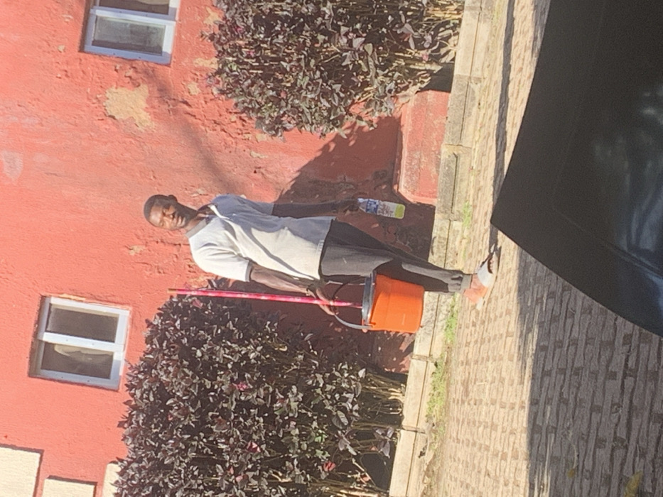 A man stands outside a building with a red facade and two windows. He wears a light grey, short-sleeved shirt and dark pants. He holds a pink-handled tool or stick and an orange bucket. Behind him are bushes, and a water bottle rests on the ground near the wall. Part of a black car is visible on the right edge of the frame. The ground is paved with rectangular stones.