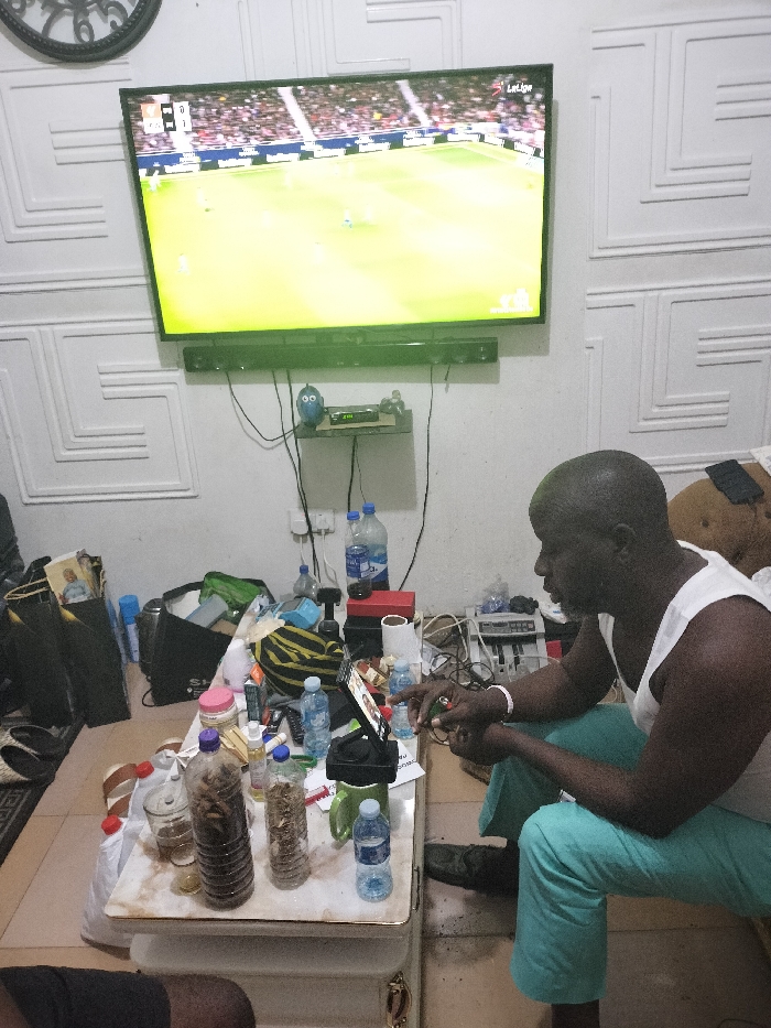 A man in a white tank top and blue pants sits near a coffee table cluttered with water bottles and jars filled with various ingredients. A flat-screen television mounted on the wall displays a soccer game. A sound bar is situated just below the television. The room's walls have a textured, geometric pattern. Other items scattered around include bags, a keyboard, and other small electronics, contributing to a slightly cluttered appearance.