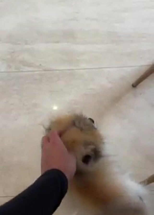 A person’s hand pets a fluffy Pomeranian dog on a light-colored, tile floor. The dog is mostly brown and white. The person petting the dog is wearing a black shirt. The legs of a chair are visible in the corner of the frame. The dog looks around and rolls over.