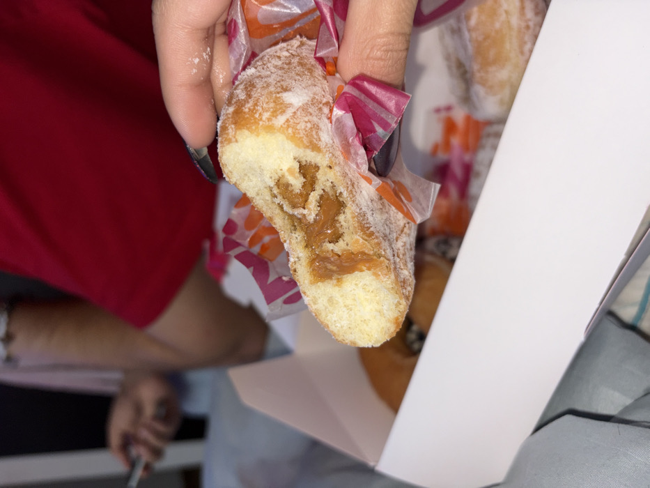 - "A close-up image shows a person's hand holding a partially consumed, sugar-dusted donut broken in half, revealing a light brown, creamy filling, consistent with *arequipe* or *dulce de leche*" by FM-htt4C2, licensed under CC BY 4.0