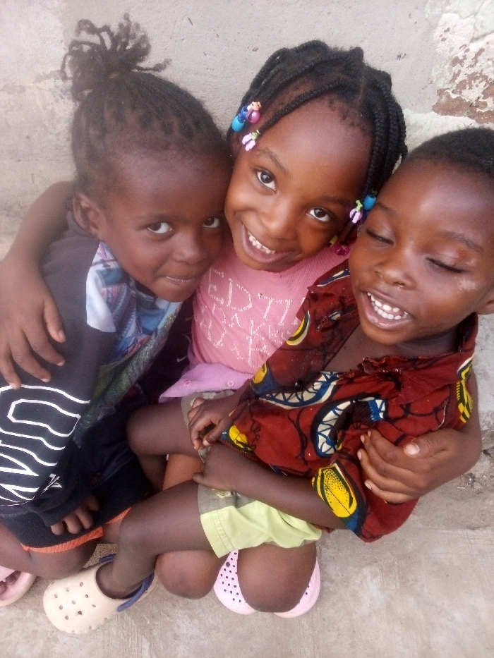 Three young children, approximately 3-7 years old, are depicted in a close-up, high-angle shot, sitting or kneeling on a light gray concrete surface against a textured, light-colored wall. The location is in the city of Unknown, Unknown. All children have dark skin tones and dark braided hair. The child on the left, appearing to be 4-6 years old, wears a dark t-shirt with white abstract patterns and dark shorts with an orange trim. Their dark braided hair is tied in a top bun/ponytail. This child looks directly at the camera with a slight smile. Their left arm is wrapped around the central child. The central child, appearing to be 5-7 years old, wears a pink long-sleeved shirt with faint white text and light pink shorts. Their dark braided hair is adorned with multiple colorful beads (pink, blue, yellow, purple). This child smiles broadly at the camera. Their right arm embraces the child on the left, and their left arm embraces the child on the right. The child on the right, appearing to be 3-5 years old, wears a red shirt with a vibrant yellow, blue, and white patterned print, paired with light green shorts. Their dark braided hair is shorter. This child's eyes are closed, and their mouth is open in a wide smile, revealing teeth. Their right arm embraces the central child. The children are in close physical contact, appearing to embrace or huddle together affectionately. The child on the left wears light pink sandals, while the child on the right wears a light beige closed-toe sandal. The background wall shows minor scuff marks or texture.