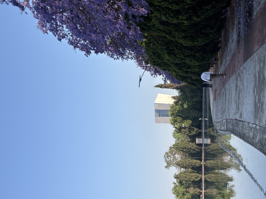 The image depicts an outdoor park scene on a clear day in Mexico City, Mexico, specifically from within Bosque de Chapultepec looking towards the Nuevo Polanco district. The prominent building in the distant background is the Museo Soumaya. A calm body of water, likely a lake, occupies the left side of the frame, its surface reflecting trees and the blue sky. A concrete retaining wall with a low metal chain barrier separates the water from a curving pathway in the foreground. The pathway is composed of a lighter gray concrete section bordered by a reddish-brown strip along its right edge. On the right side of the path, a dense line of dark green, manicured evergreen shrubs or bushes runs parallel to the path. Above these shrubs, a large jacaranda tree with vibrant purple blossoms extends into the upper right corner of the frame, with some fallen purple petals visible on the pathway. A black streetlamp with a horizontal arm is positioned above the jacaranda tree. In the mid-ground, beyond the lake, a line of various green trees, including tall slender cypress-like trees, forms a natural barrier. Above the treeline, in the far background, the distinct, modern, light-colored facade of the Museo Soumaya is visible, characterized by its textured vertical design. Four individuals are present. One person, wearing a white long-sleeved shirt, dark pants, and red shoes, walks away from the camera on the path in the mid-ground, with their back to the viewer. Further down the path, near the lake's edge, another individual in dark clothing is standing. Two additional, more distant figures are observable near the far edge of the lake, one standing upright and another appearing to be standing or sitting low near the water. The sky above is clear and light blue.