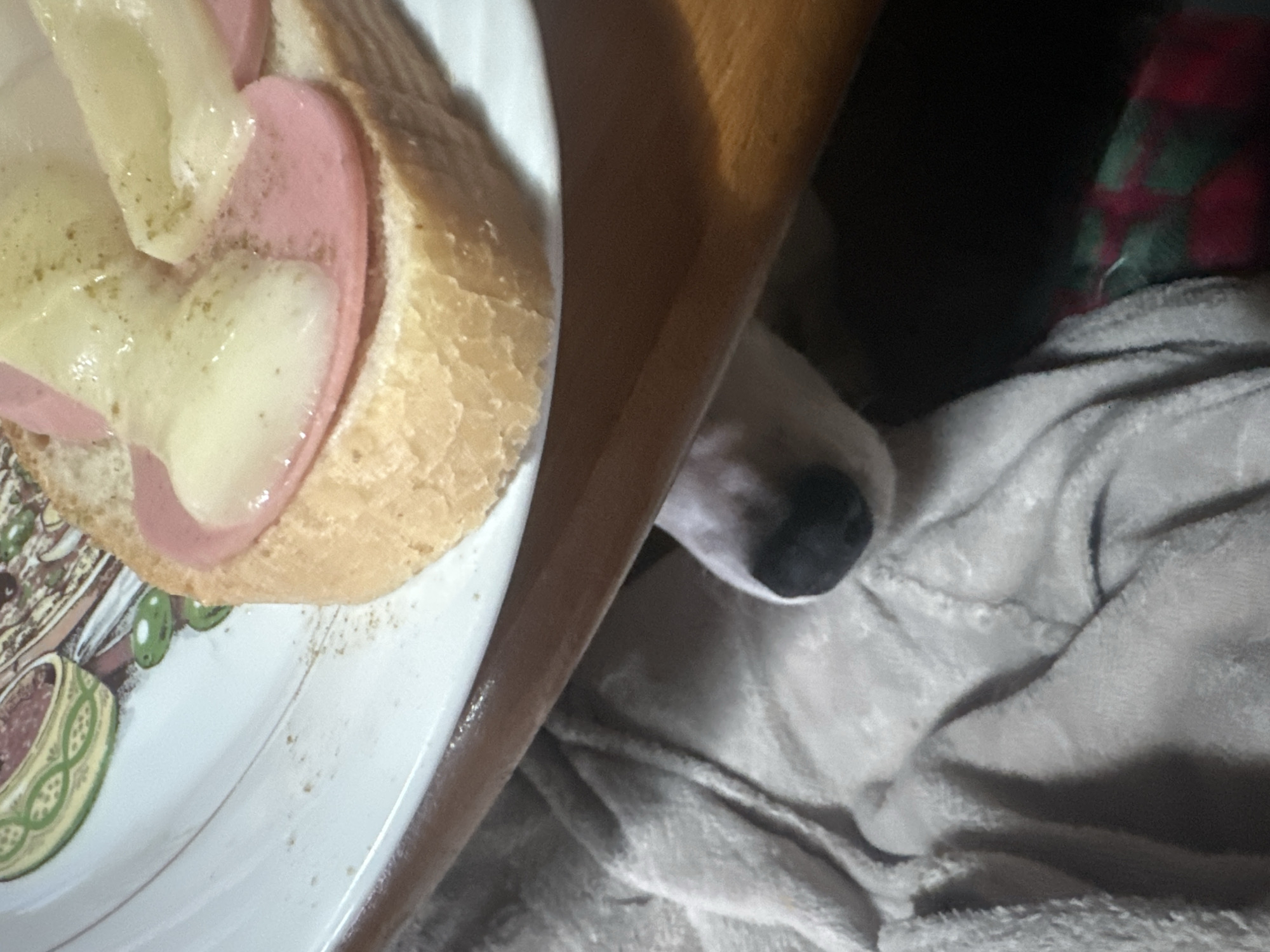 The scene is an interior setting in Aldomirovtsi, Bulgaria, depicting a white ceramic plate positioned on a light brown wooden surface, likely a table. The plate features a decorative rim with a green band pattern and reddish-brown elements, including what appears to be green olives. On the plate rests a single slice of white bread, topped with two circular slices of pink processed meat, which are covered by melted pale yellow cheese. Brown granular seasoning is visible on the cheese and scattered on the adjacent plate surface. Beneath the table, partially resting on a light gray, textured blanket, a white dog's snout with a prominent black nose is visible, angled upwards towards the food. A red and green plaid fabric is partially discernible in the lower right background.