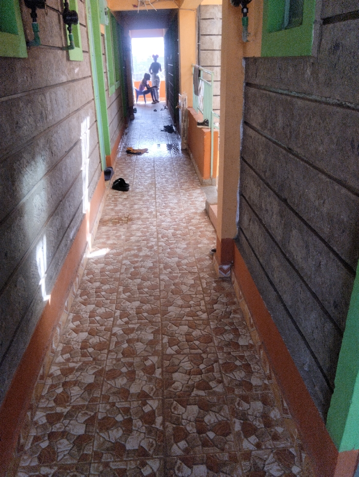 An image taken in Witeithie ward, Kenya, depicts a narrow, tiled residential corridor extending towards an open doorway