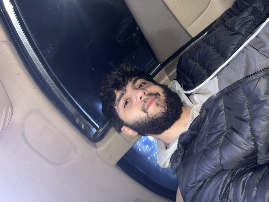 A young man with dark curly hair and a full beard lies in a car, looking towards the camera with a slight smile. He wears a black puffer jacket over a gray hoodie. Above him, a sunroof reveals a dark, possibly rainy, night sky with blurred lights. The car's interior is beige, and the overall composition is tilted, creating a casual, selfie-style perspective.