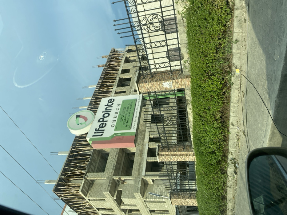 This image depicts the LifePointe Church building under construction in Ilado, Nigeria, viewed from a street-level perspective