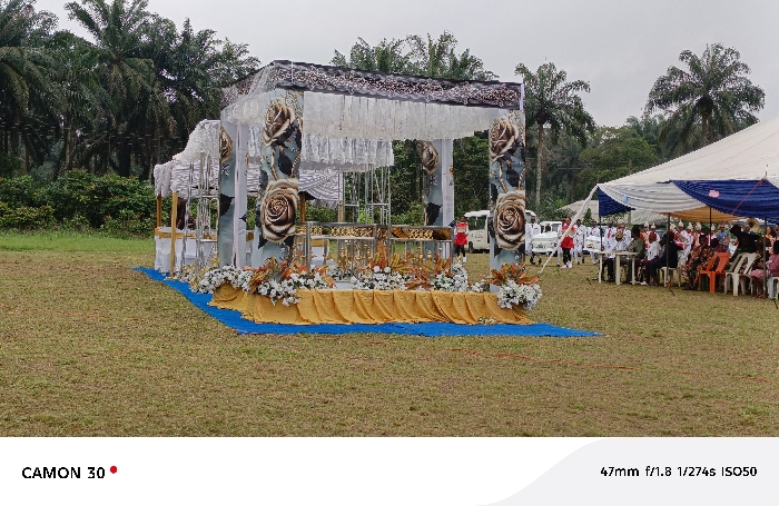 An outdoor event is depicted on an open, patchy grass field, likely a rural or semi-rural setting, under an overcast sky. A central decorative canopy features four posts adorned with large sepia-toned rose images, white fabric drapes, and a black and white patterned border. Beneath the canopy, a golden-yellow pleated fabric skirt rests on a blue mat, displaying arrangements of white and orange flowers and golden ornate structures. To the right, approximately 30-40 individuals are seated on various chairs (white plastic, orange, patterned) under a large white and blue striped tent, observing the scene. In the background, a dense line of palm trees and other green foliage borders the field. Several individuals, some wearing white shirts, are visible in the mid-ground, alongside a white golf cart and other white vehicles.