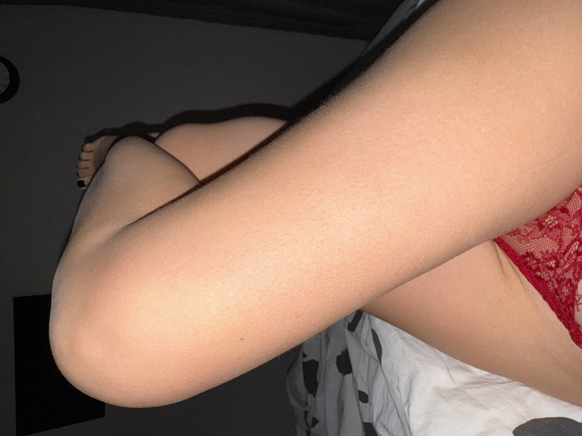 A close-up shot depicts a person with fair skin lying on a bed. The person's legs are crossed, with the right leg closer to the camera and obscuring part of the left. Red lace underwear is visible on the right side of the frame. The background includes a white sheet with black spots and a dark wall. The location is unknown; there is no evidence to suggest the city of Chaikovsky, Russia.