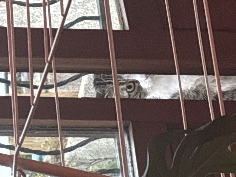 - "A domestic cat is depicted peering through a vertical gap in a dark reddish-brown frame, observed from an interior perspective looking outwards in Montreuil, France" by FM-rcZfH3, licensed under CC BY 4.0