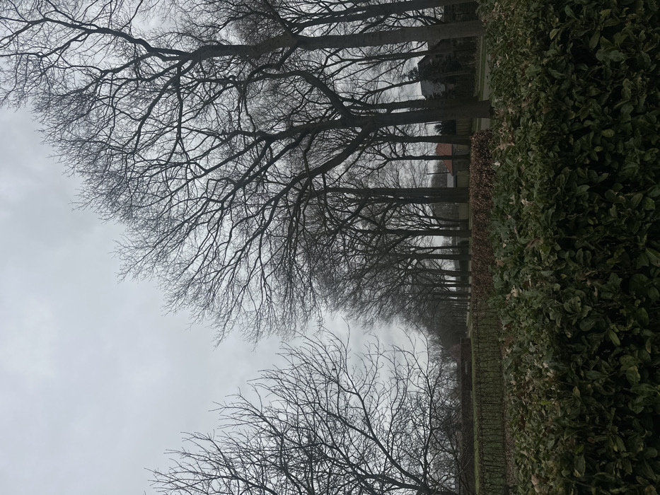 The image captures an outdoor scene in Oploo, Netherlands, under an overcast sky. The sky is uniformly grey, indicating heavy cloud cover. In the foreground, a dense, dark green evergreen hedge runs horizontally across the bottom of the frame, behind which a parallel row of reddish-brown deciduous shrubbery is visible. A straight asphalt or dirt road extends centrally into the midground, flanked on both sides by a double line of tall, bare deciduous trees. These trees are devoid of leaves, their dark branches forming intricate patterns against the pale sky. In the background, on the right, parts of a building with a distinct reddish-orange tiled roof are visible through the trees. No individuals, animals, or discernible activities are present within the frame.