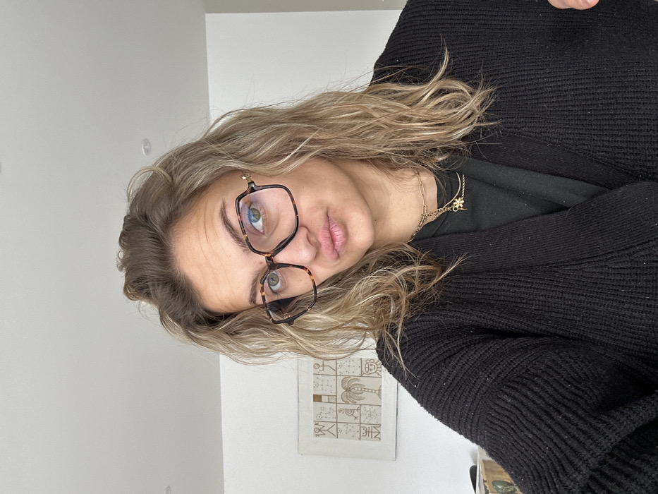 A forensic description of the image reveals a medium close-up of a female subject indoors in Veauchette, France. The subject, with shoulder-length wavy light brown hair, is wearing oversized, octagonal tortoiseshell-patterned eyeglasses. Her lips are pursed in a slight pout, and her gaze is directed towards the viewer. She is clad in a black ribbed knit cardigan over a dark top. Around her neck are two layered gold-colored necklaces: one a paperclip chain, the other a finer chain with a small, stylized flower pendant. The background consists of a plain, light-colored wall. To the left of the subject, a framed piece of white and gold artwork depicting abstract figures and a palm tree motif within a grid is visible. The lighting is bright and even.