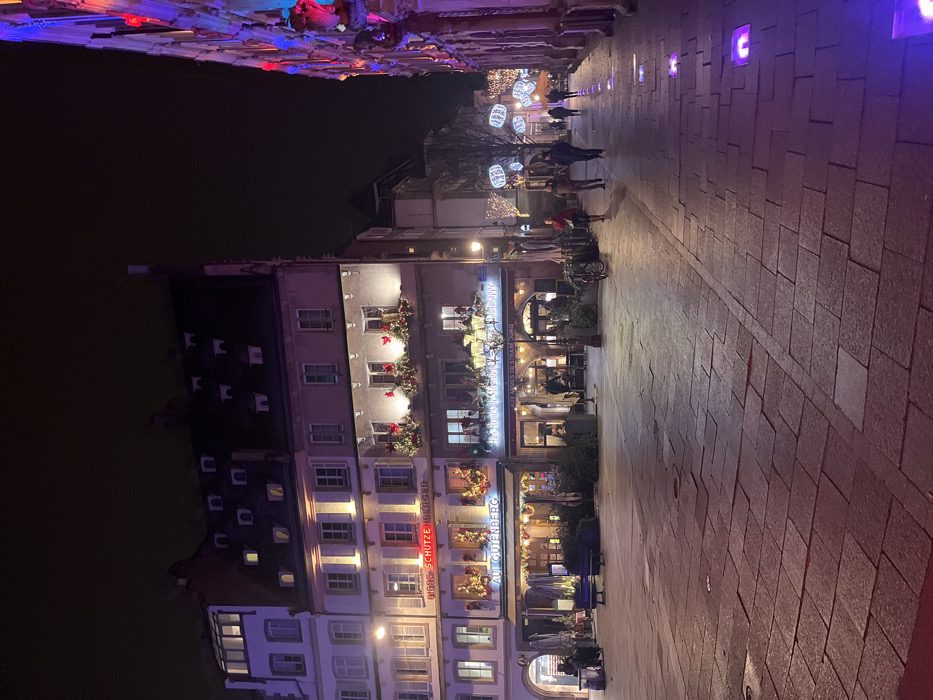 A night scene in a European city shows buildings decorated with Christmas garlands and lights. A restaurant called "AU GUTENBERG" is visible, lit with festive decorations. People walk along a brick-paved street illuminated by purple lights embedded in the ground. The scene suggests a festive atmosphere, likely during a Christmas market or holiday celebration. The image is rotated counter clockwise.